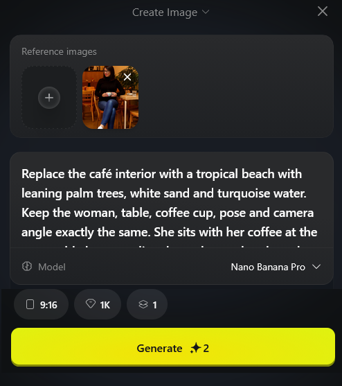 Die ursprüngliche Caféumgebung wird vollständig durch eine tropische Strandkulisse ersetzt, während Sitzposition, Tisch und Kaffeemoment unverändert bleiben. Palmen, Sand und Meer schaffen eine neue Urlaubsatmosphäre bei identischer Bildkomposition. Geeignet für kreative Szenenwechsel und Social-Media-Visuals.