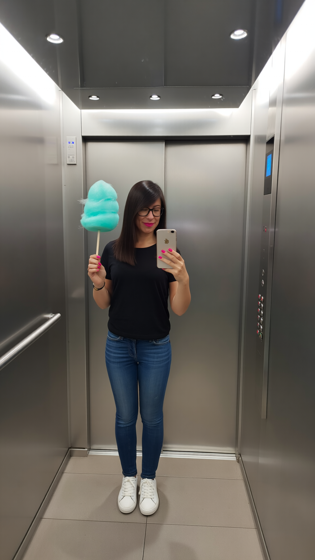 Fahrstuhl-Selfie mit Cotton-Cloud – surreale Farbexplosion