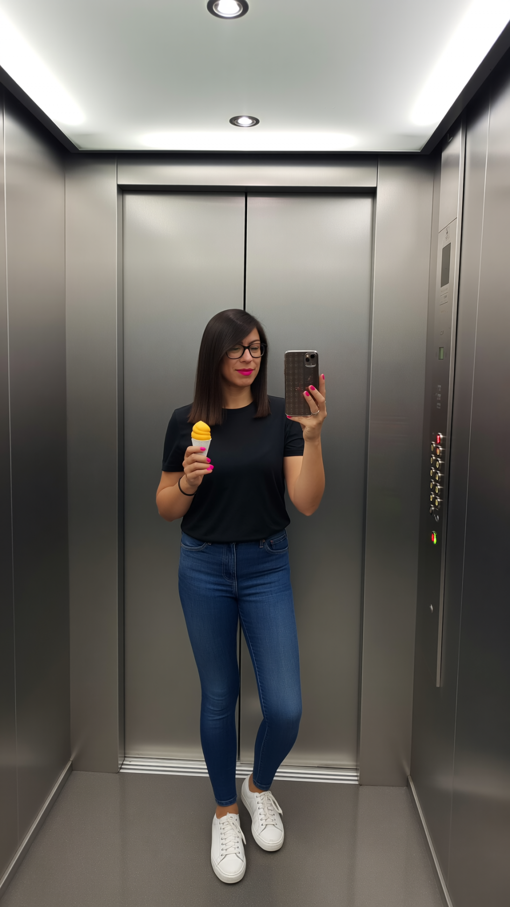 Person (z. B. eigener KI Twin) im Fahrstuhl.