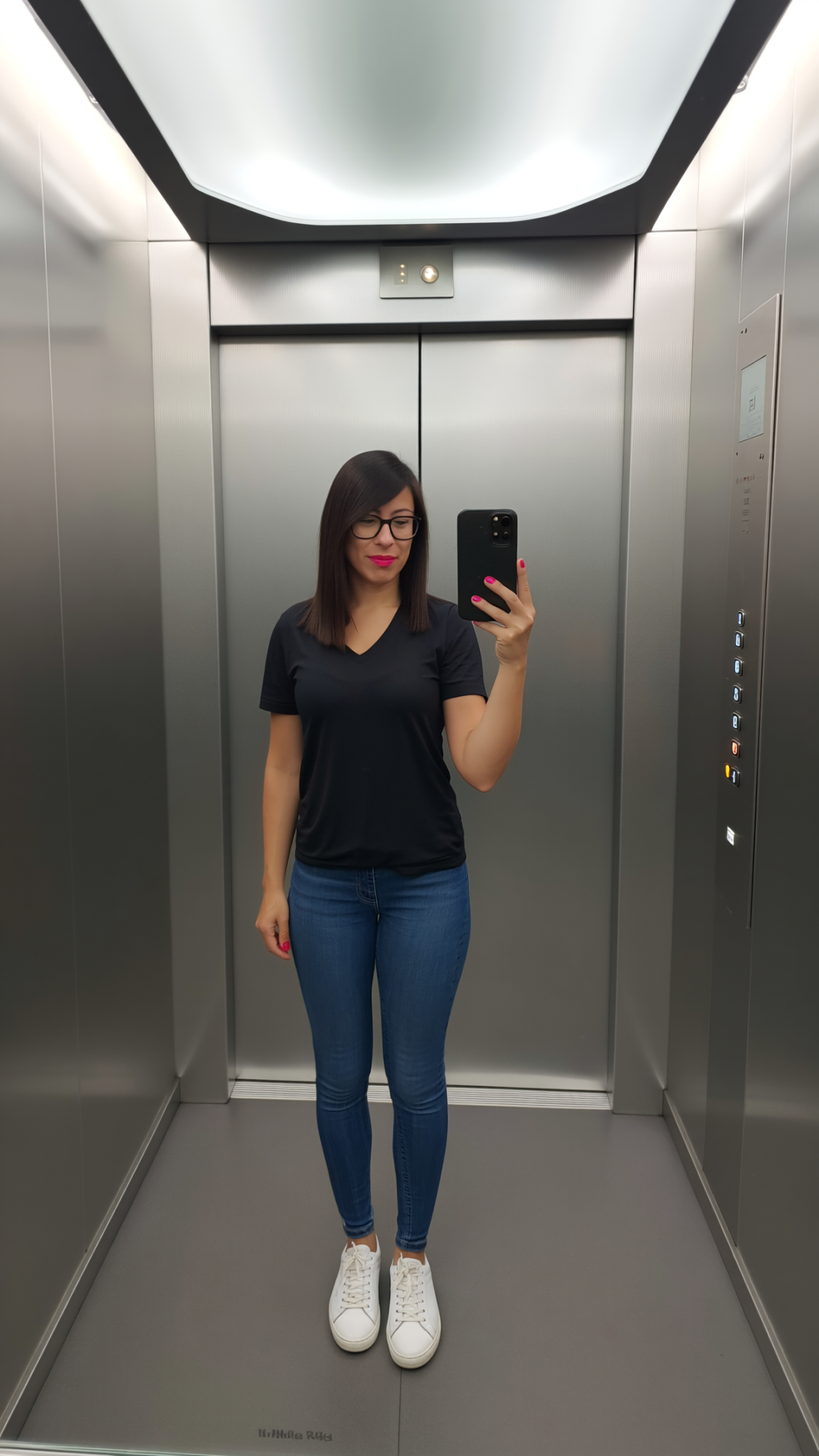 Spiegel-Selfie im Fahrstuhl mit Objekt als Farb-Statement