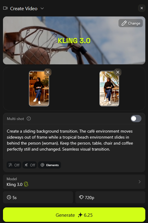 Café-Szene verwandelt sich durch eine seitliche Übergangsbewegung in eine tropische Strandkulisse. Die Person, der Tisch und der Kaffee bleiben unverändert, während sich die Umgebung nahtlos von Stadtatmosphäre zu Urlaubsstimmung wandelt. Geeignet für Social Media Reels, kreative Übergangseffekte, Storytelling-Content und aufmerksamkeitsstarke Video-Visuals.
