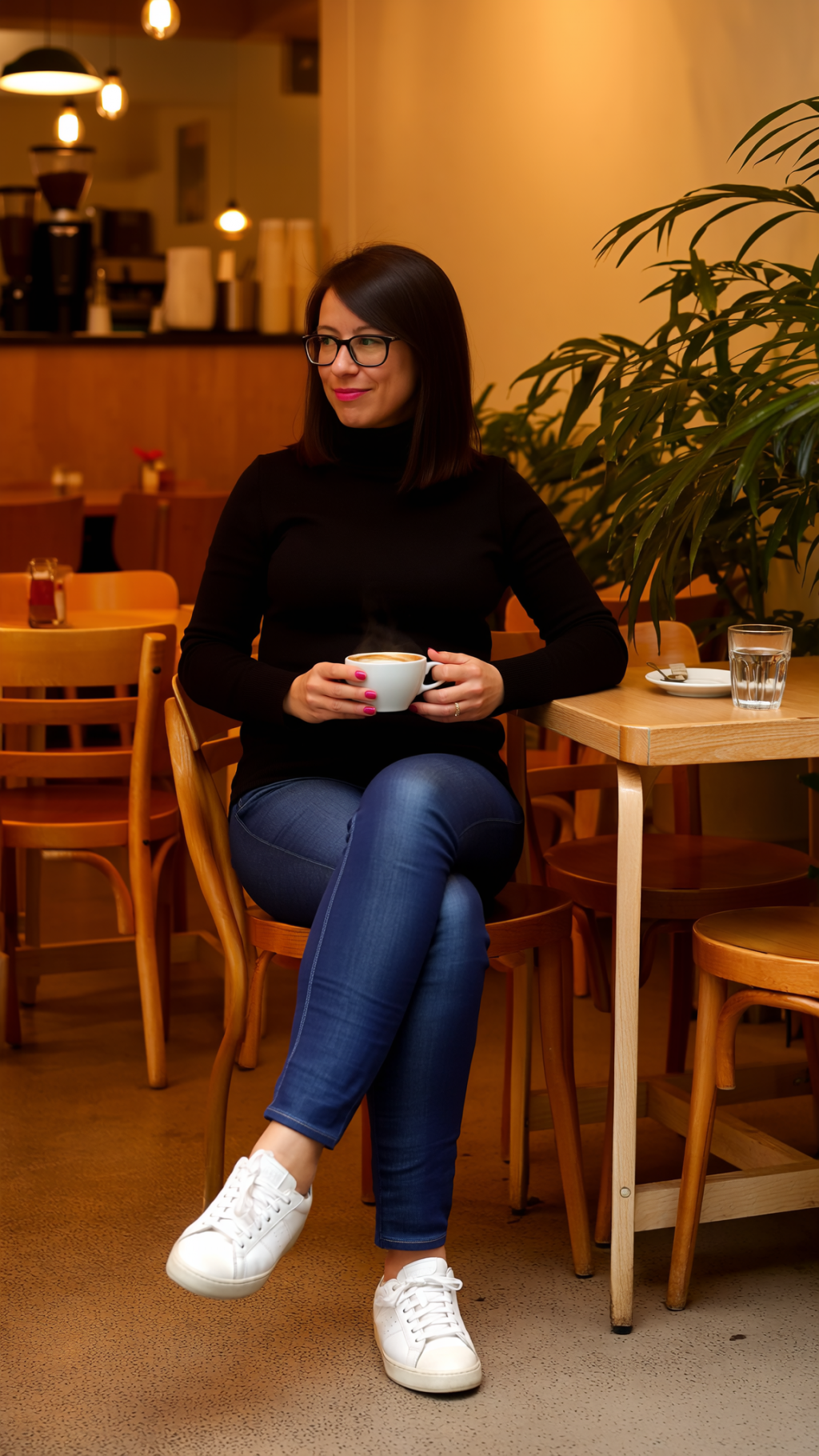 Person (z. B. eigener KI Twin) mit Café-Hintergrund.