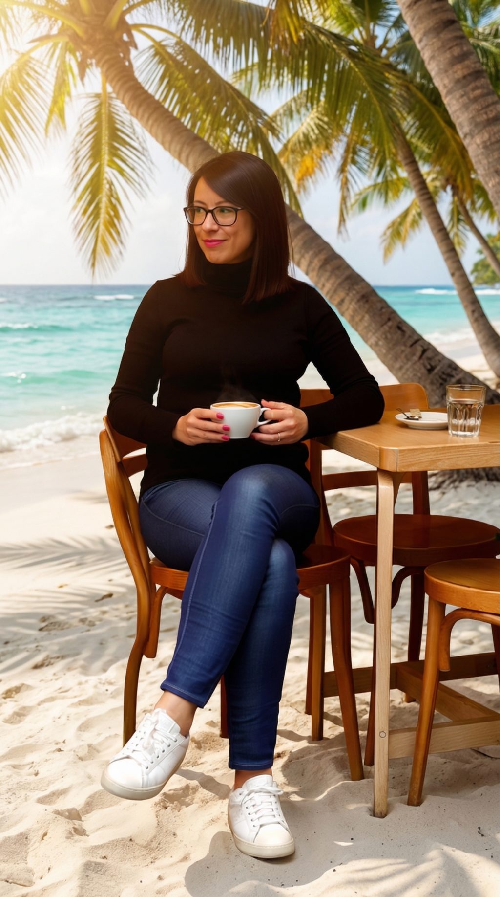 Person (z. B. eigener KI Twin) mit Strand-Hintergrund.
