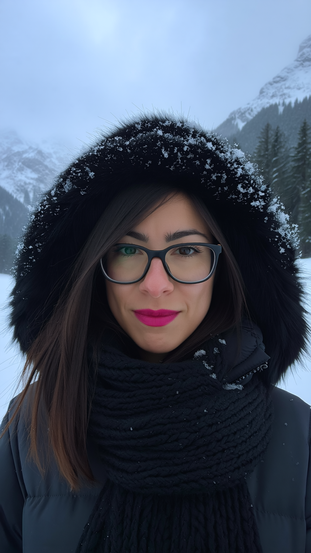 Winterporträt in einer verschneiten Berglandschaft, gekleidet in einem schwarzen Parka mit Fellkapuze und Schal. Die Szene wirkt klar, kühl und zugleich nahbar – ideal für winterliche Porträts, Outdoor-Themen oder stimmungsvolle Social-Media-Beiträge.